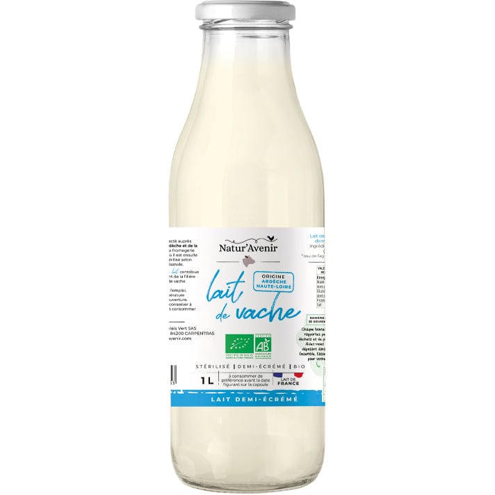 Lait de vache demi-écrémé homogénéisé et stérilisé BIO, conditionné en bouteille verre consignée