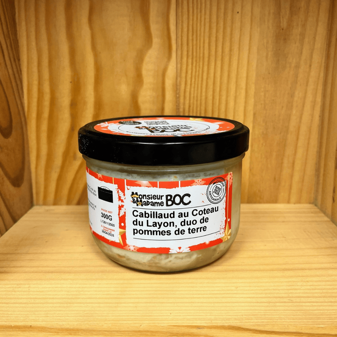 Cabillaud 33%, pommes de terre, patates douces, crème, Coteau du Layon, beurre, échalotes, vinaigre blanc, ail, fécule de pommes de terre, sel, sucre, curcuma, poivre