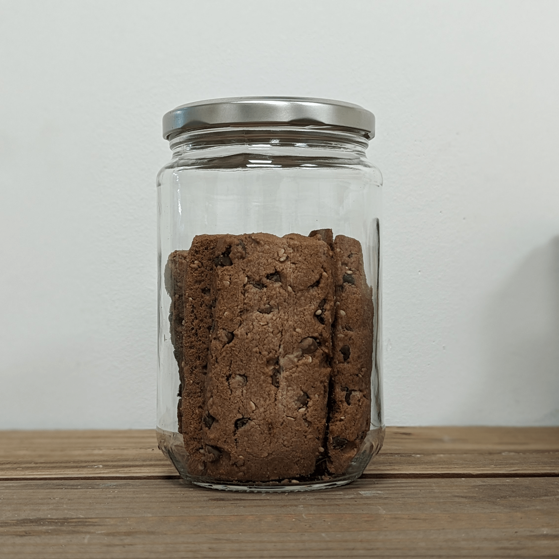 Farine de blé*1, sucre de canne roux*1, œuf*, pépites de chocolat au lait*(8%) (sucre de canne*1, lait entier en poudre*, beurre de cacao*1, pâte de cacao*1), huile de tournesol*, pépites de chocolat noir*(7%) (pâte de cacao*1, sucre de canne*1, beurre de cacao*1), graines de sésame*(4%), cacao en poudre*1, poudre à lever* (fécule de pomme de terre*, bicarbonate de sodium, acide tartrique), sel de Guérande.